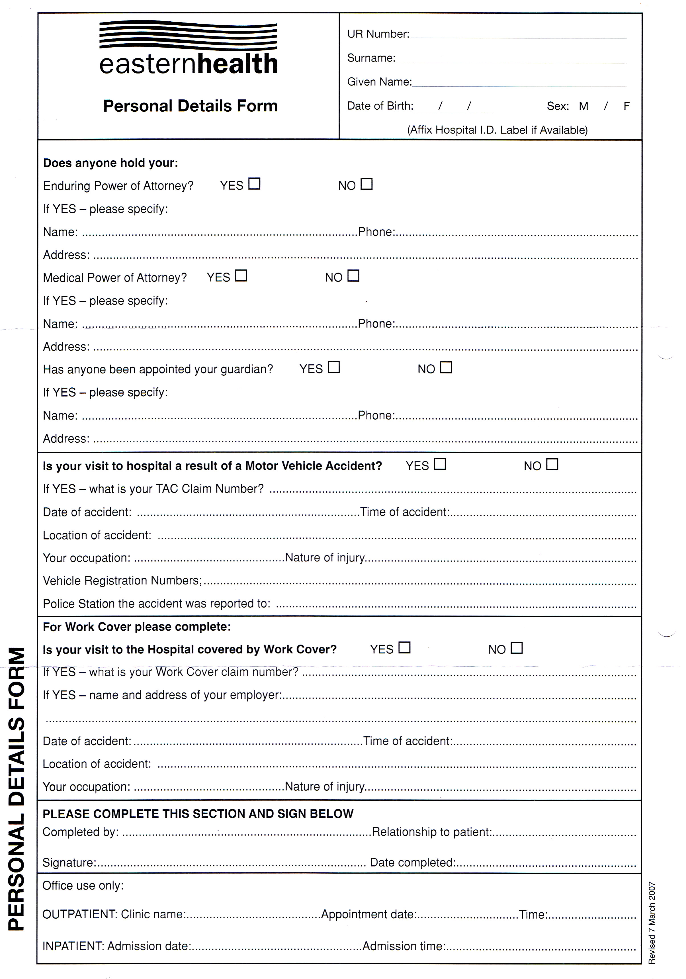 Eastern Health, Client Details Form